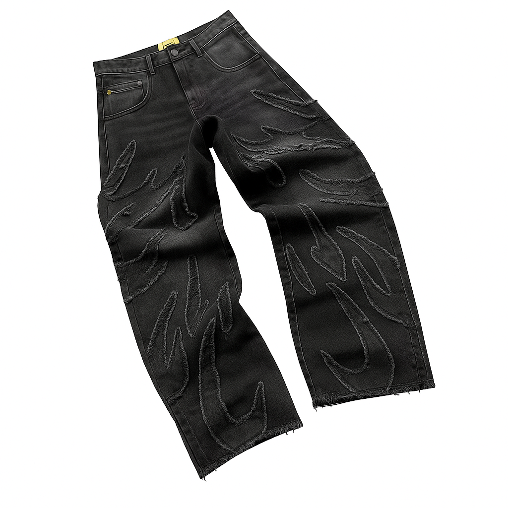 Streetwear meets craftsmanship. These jeans feature unique embroidered flame details, giving your fit a standout edge. Wide-leg cut for ultimate comfort and a retro street vibe.