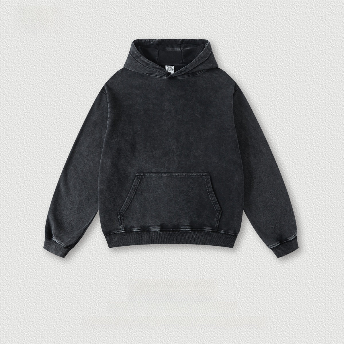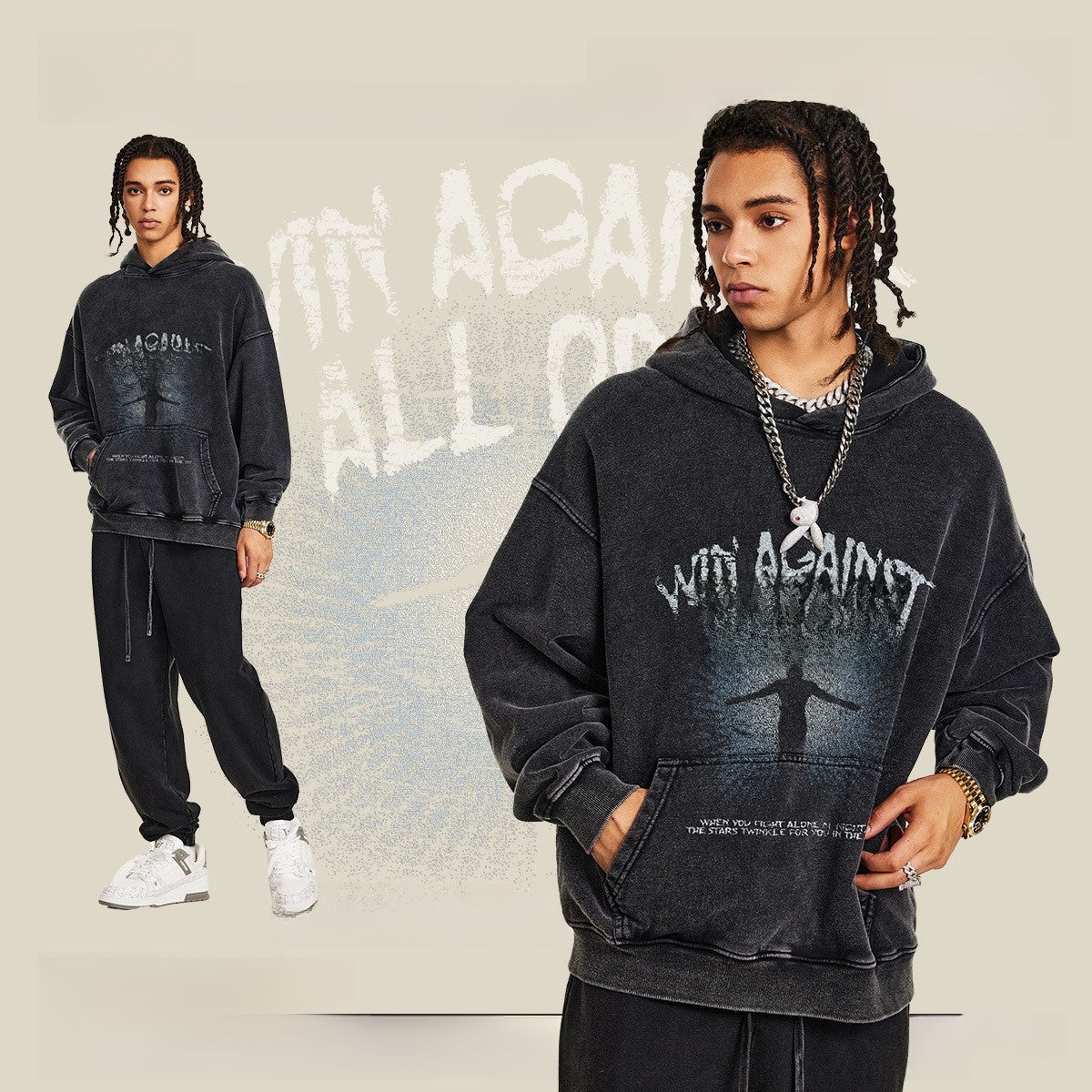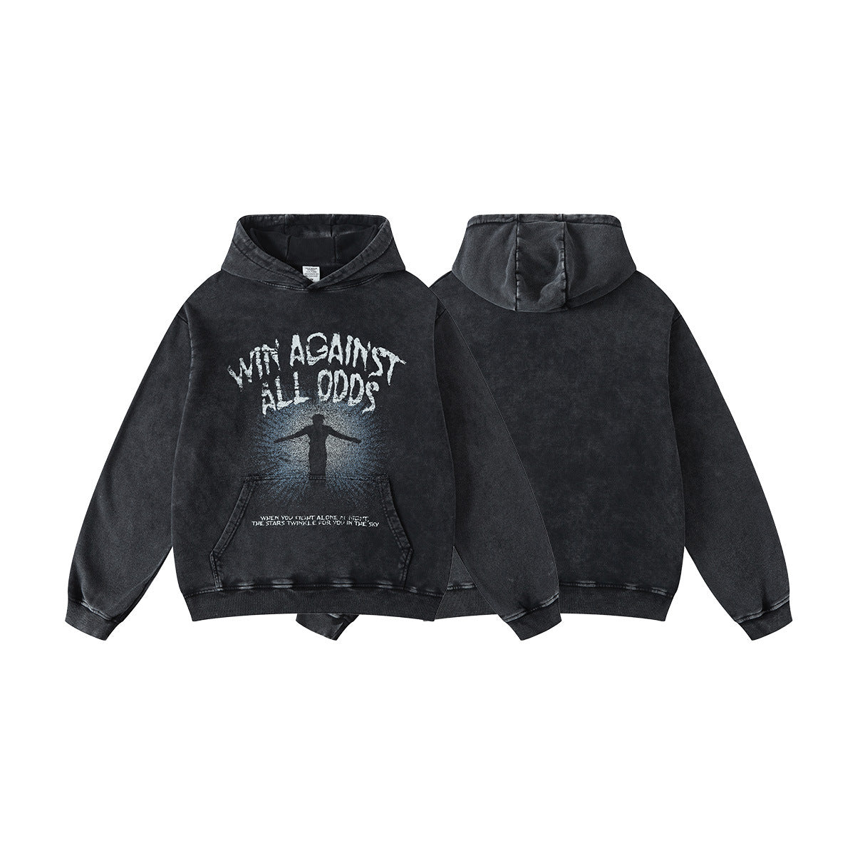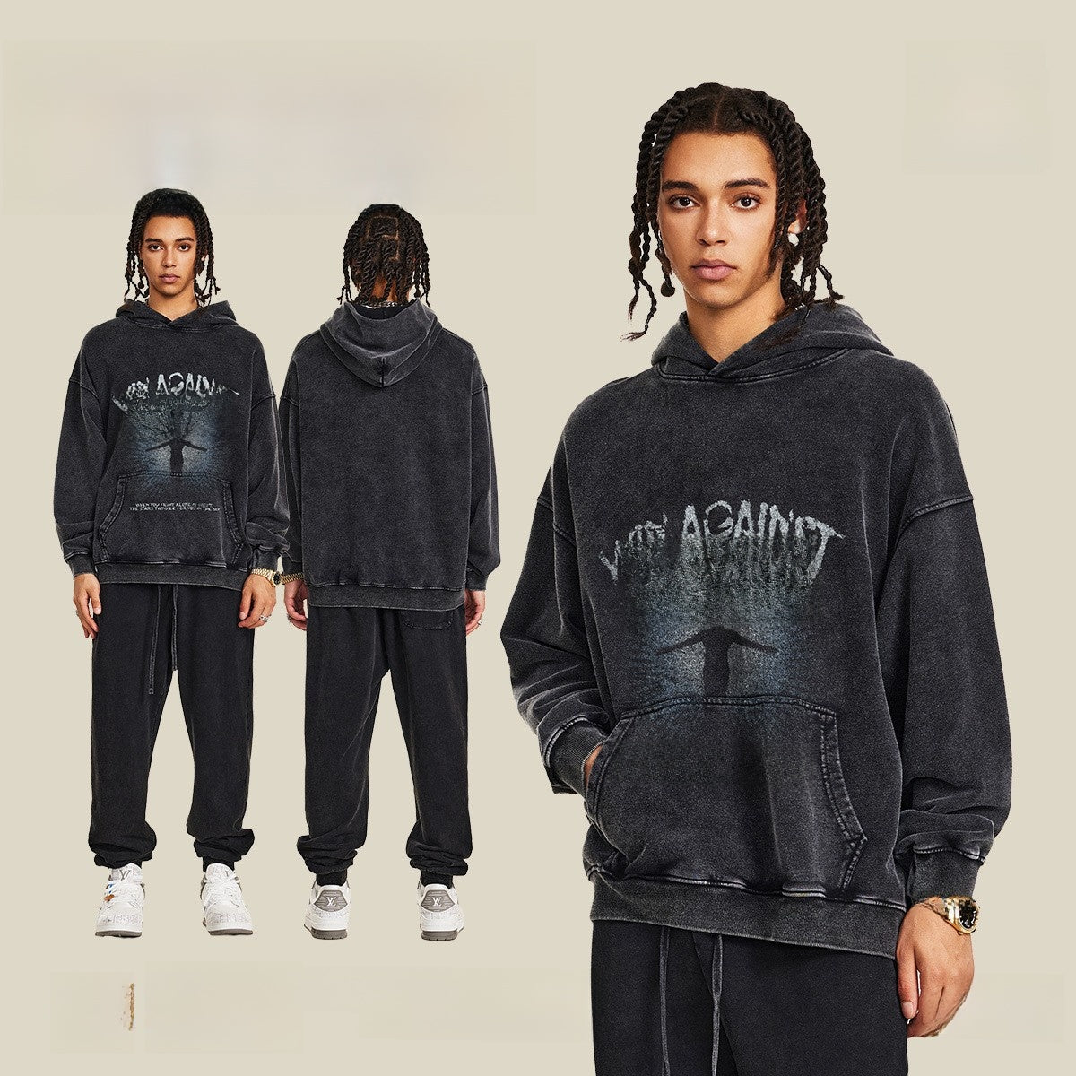 Stand strong with this bold statement hoodie. Featuring a washed black look and powerful graphic print, it’s the perfect piece for an edgy streetwear fit.
