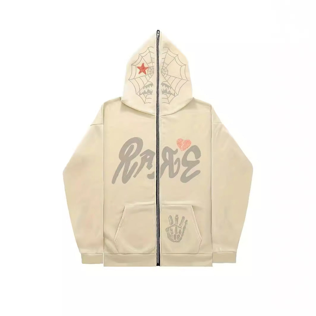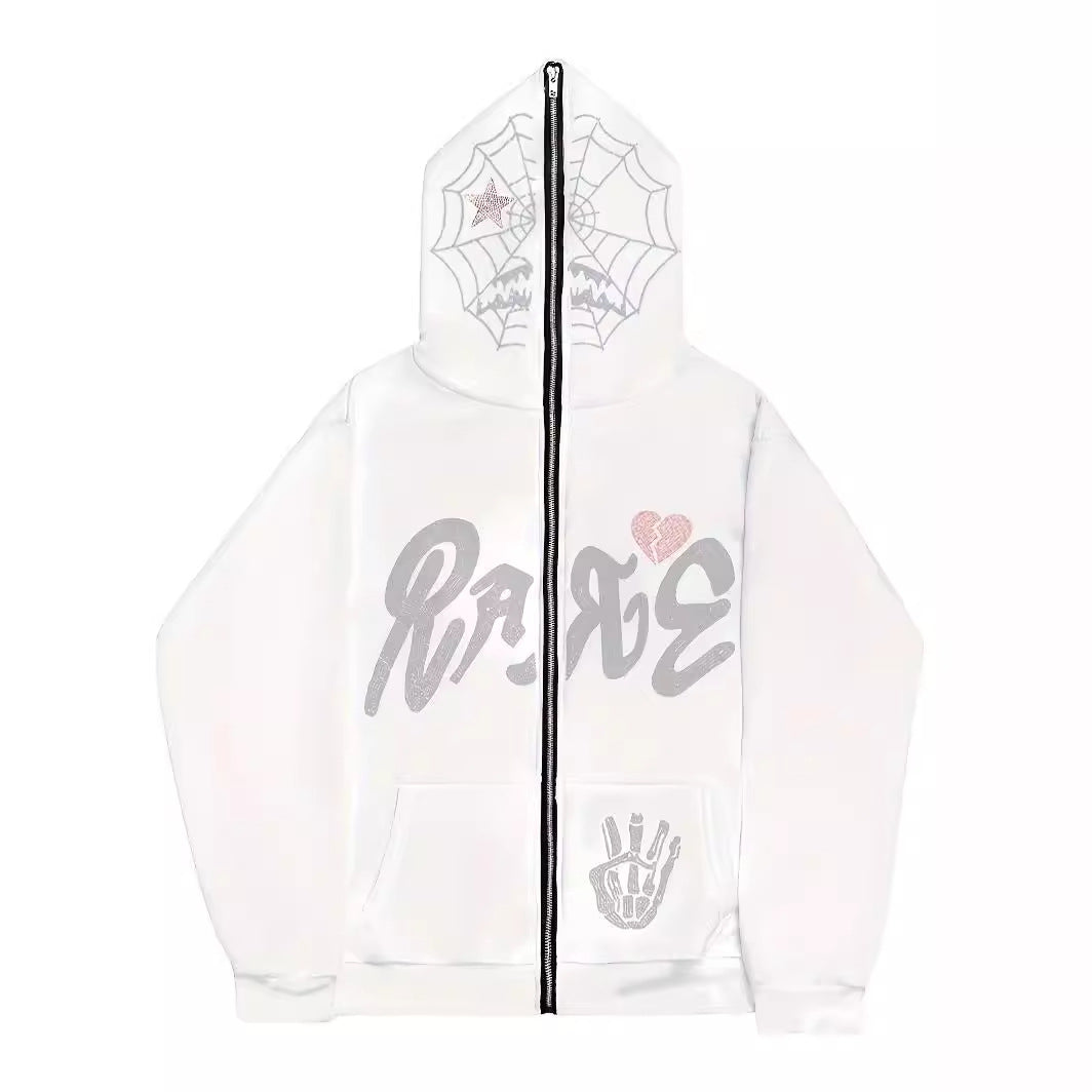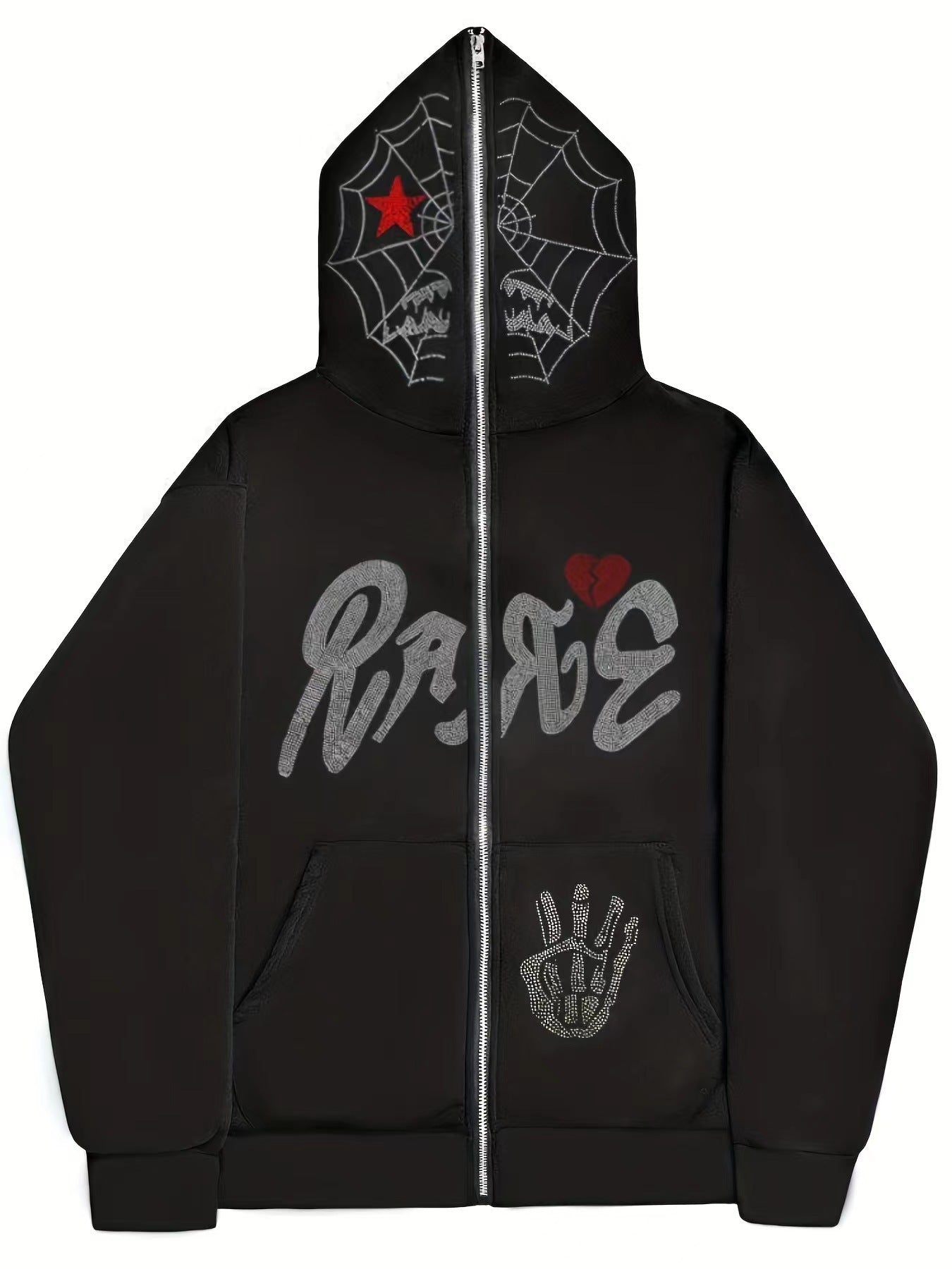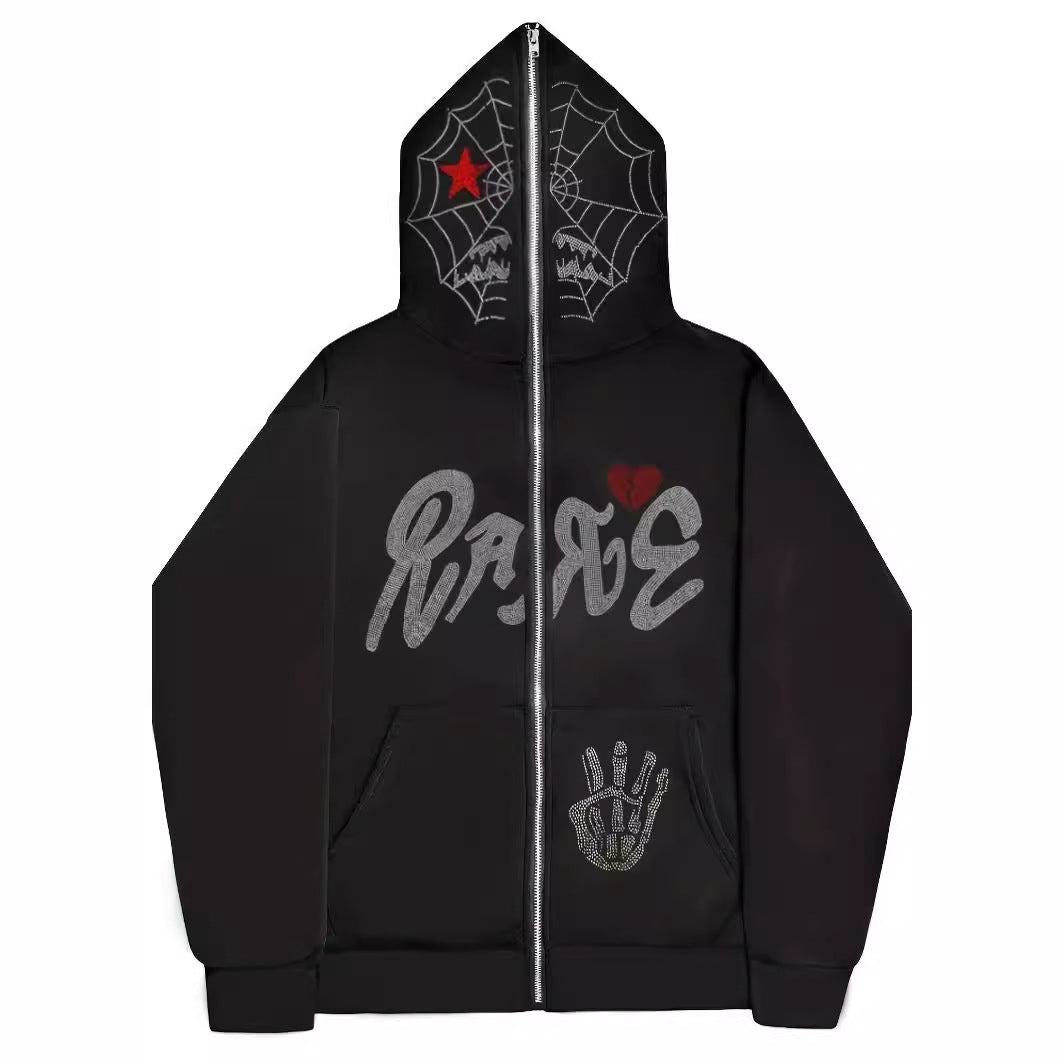 Fleece zip-up hoodie with bold spider graphic print. Soft, cozy fabric and relaxed fit — perfect Y2K streetwear essential.